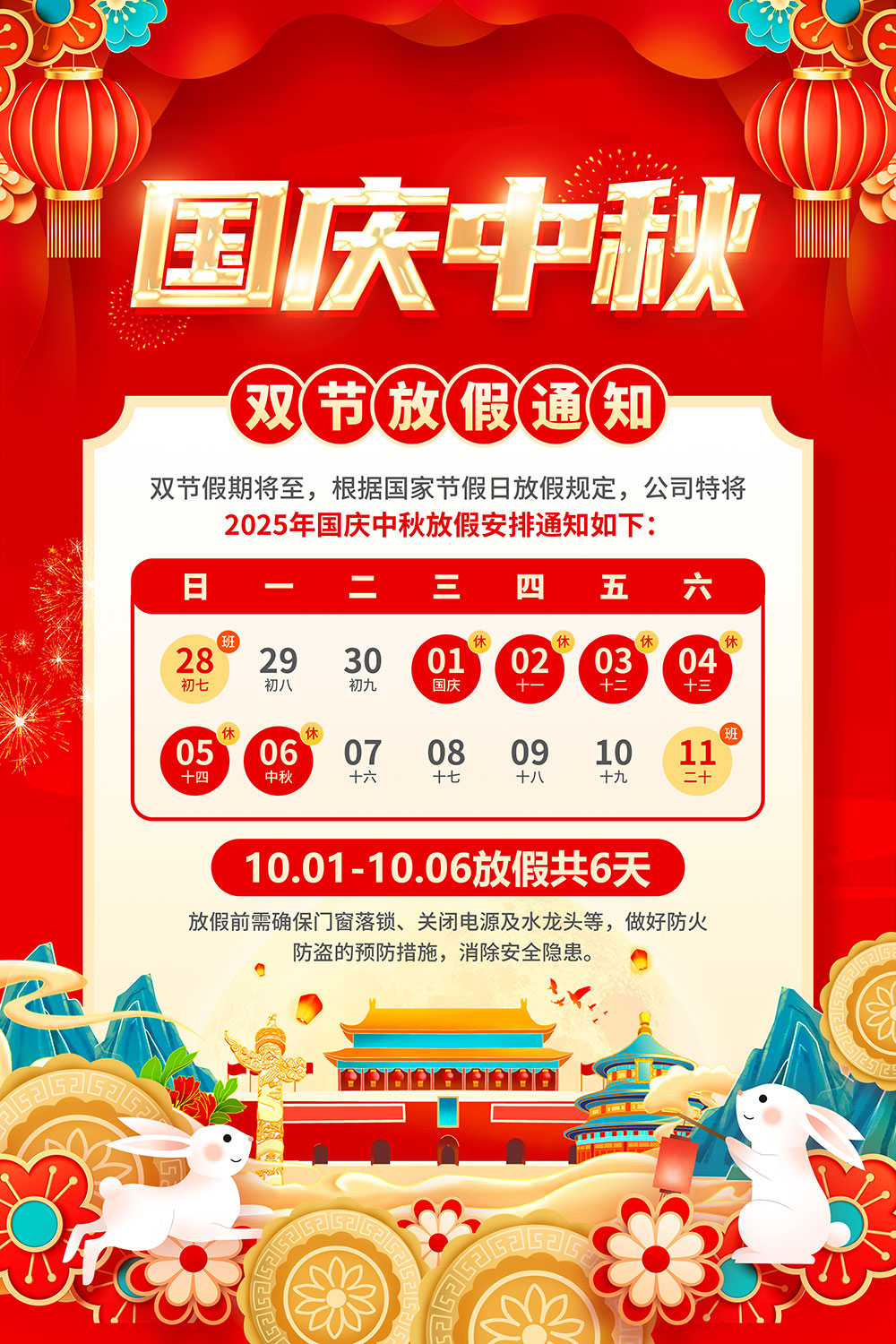 根据《国务院办公厅关于2025年部分节假日安排的通知》,结合我公司的实际情况,现将我公司2025年国庆、中秋双节放假具体安排如下:
